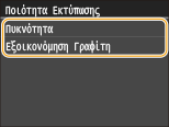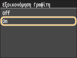 Εάν αγγίξετε <On>, η εκτύπωση πραγματοποιείται σε λειτουργία εξοικονόμησης γραφίτη. Επιλέξτε <On> όταν θέλετε να ελέγξετε τη διάταξη ή άλλα χαρακτηριστικά εμφάνισης προτού προχωρήσετε στην τελική εκτύπωση μιας μεγάλης εργασίας.
