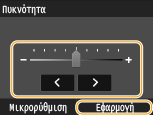/ και μετά αγγίξτε <Εφαρμογή>. Έχετε υπόψη σας ότι εάν η ρύθμιση <Εξοικονόμηση Γραφίτη> έχει τεθεί σε <On>, δεν θα μπορείτε να ορίσετε αυτό το στοιχείο.![]() ![]() Λεπτομερής ρύθμιση της πυκνότητας γραφίτη