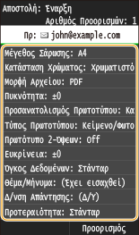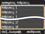 Για επεξεργασία ή διαγραφή καταχωρισμένων ρυθμίσεων, μεταβείτε στην επιλογή <Σάρωση>  <E-Mail>/<I-Φαξ>/<Αρχείο>  <Αγαπημένες Ρυθμίσεις>  <Επεξ./Διαγραφή>  <Επεξεργασία> ή <Διαγραφή> και μετά ακολουθήστε τα παρακάτω βήματα.