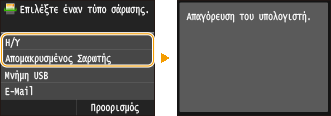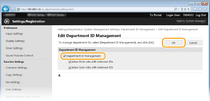 Κάντε κλικ για να βεβαιωθείτε ότι έχουν εισαχθεί ο σωστός κωδικός και PIN. Αυτή η λειτουργία δεν είναι διαθέσιμη εάν το μηχάνημα και ο υπολογιστής συνδέονται μέσω θύρας USB ή WSD (Υπηρεσίες Web σε συσκευές). [Confirm Department ID/PIN When Printing] (Επιβεβαίωση PIN/κωδικού τμήματος κατά την εκτύπωση)/[Confirm Department ID/PIN When Sending Faxes] (Επιβεβαίωση PIN/κωδικού τμήματος κατά την αποστολή φαξ)