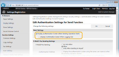 Η πιστοποίηση στο διακομιστή γίνεται με το όνομα χρήστη και τον κωδικό πρόσβασης που έχετε εισαγάγει στην οθόνη σύνδεσης για εξουσιοδοτημένη αποστολή. Εάν επιλέξετε το πλαίσιο ελέγχου [Display Authentication Screen], στην οθόνη πιστοποίησης θα εμφανίζονται το όνομα χρήστη και ο κωδικός πρόσβασης που καταχωρήσατε κατά την αποστολή των δεδομένων.