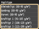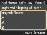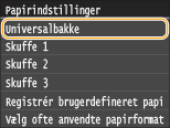 Når standardindstillingen er registreret, vises skærmen for papirindstillinger ikke, når der ilægges papir, og den samme indstilling bruges hver gang. Hvis du ilægger et andet papirformat eller en anden papirtype uden at ændre papirindstillingerne, kan maskine ikke udskrive korrekt. For at undgå dette problem skal du vælge <Angiv ved ilægning af papir> i trin 3 og derefter ilægge papiret.