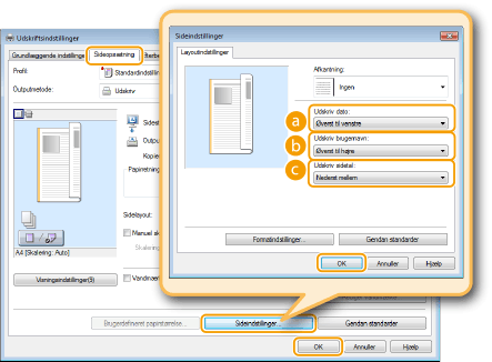 Vælg udskriftsplaceringen af udskriftsdatoen, logonnavnet eller sidetallet