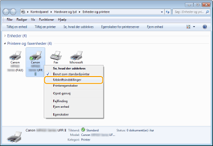 Højreklik på printerdriverikonet for denne maskine, og klik på [Udskriftsindstillinger].