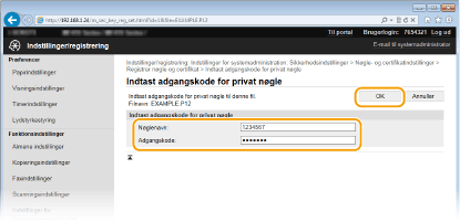 Angiv navnet på nøgleparret og adgangskoden, og klik derefter på [OK].