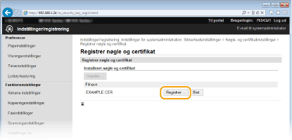 Klik på [Registrer nøgle og certifikat] eller [Registrer CA-certifikat].
