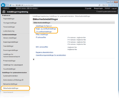 [Nøgle- og certifikatindstillinger] eller [CA-certifikatindstillinger].