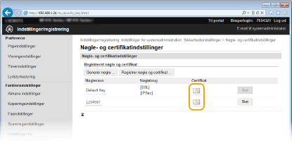 Klik på [Nøgle- og certifikatindstillinger] for at bekræfte et nøglepar eller [CA-certifikatindstillinger] for at bekræfte et CA-certifikat.