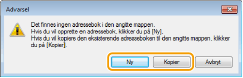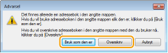 Hvis det allerede finnes en adressebok på stedet du har valgt til lagring i trinn 5, vises meldingen nedenfor. Hvis du vil bruke den eksisterende adresseboken, klikker du på [Bruk som den er]. Hvis du vil overskrive den med den gjeldende adresseboken, klikker du på [Overskriv].
