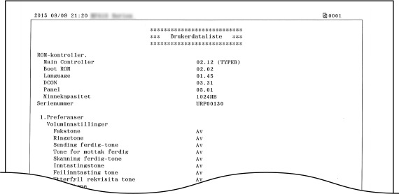 <Brukerdataliste> inneholder ikke innstillingslistene over <Nettverksinnstillinger> og <Systemstyringsinnstillinger>, og deler av innstillingslisten over <Faksinnstillinger>. Hvis du vil kontrollere alle innstillingselementene, inkludert <Nettverksinnstillinger> og <Systemstyringsinnstillinger>, skriver du ut <Systemansvarliges dataliste>.