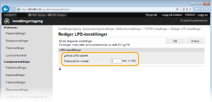 Angi en verdi mellom 1 og 60 (minutter) som omstartsventetid for datamottak. Hvis datamottak ikke starter igjen innenfor den angitte tide, avbrytes utskriften. |