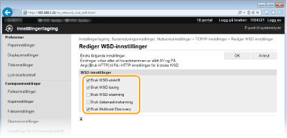 Merk av i boksen for å hente informasjon om maskinen fra en datamaskin via WSD. Det er merket av i boksen automatisk når det også er merket av for [Bruk WSD-utskrift]. [Bruk WSD-skanning]