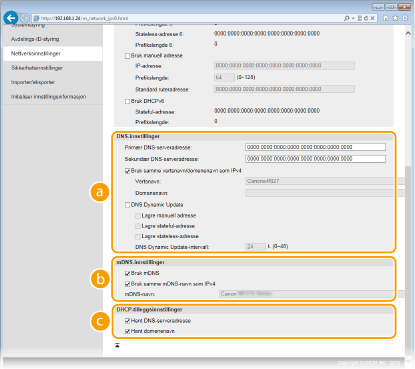 Merk av i boksen for en dynamisk oppdatering av DNS-postene når maskinens IP-adresse endres. Hvis du vil angi typen(e) adresser du vil registrere på DNS-serverer, merker du av for [Lagre manuell adresse], [Lagre stateful-adresse] eller [Lagre stateless-adresse]. Hvis du vil angi intervallet mellom oppdateringer, angir du tiden i timer i tekstboksen [DNS Dynamic Update-intervall]. [mDNS-innstillinger][Bruk mDNS]
