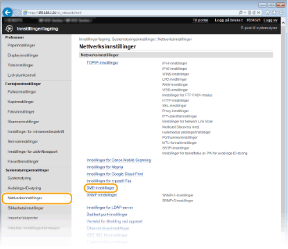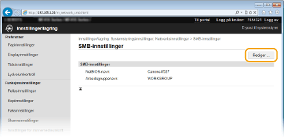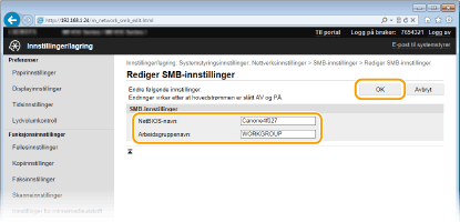 Server Message Block (SMB) er en protokoll for deling av ressurser, for eksempel filer og skrivere, med flere enheter på et nettverk. Maskinen bruker SMB til å lagre skannede dokumenter i en delt mappe. Alt etter hvilket nettverk du bruker, må du kanskje angi NetBIOS-navnet og navnet på arbeidsgruppen.