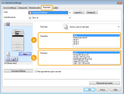 Ved å sette <Prioriter driverinnstillinger under utskrift> til <På>, kan du skrive ut fra papirkilden som er angitt i skriverdriveren, uavhengig av papirinnstillingene i maskinen. Prioriter driverinnstillinger under utskrift