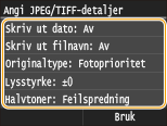 / for å justere lysstyrken og trykk på <Bruk>.<Lysstyrke> er ikke tilgjengelig for utskrift av de TIFF-filene som ikke er JPEG-komprimert.