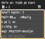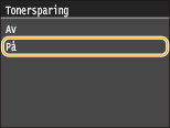 Når du trykker på <På> skrives det ut med toner i sparemodus. Velg <På> når du ønsker å sjekke oppsettet eller andre utseendemessige ting før du går videre med den endelige utskriften av en stor jobb.