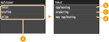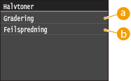 Du kan velge utskriftsmetode for å gjengi halvtoner (området mellom de lysere og mørkere områdene i et bilde) for optimal bildekvalitet. Trykk på <Gradering> eller <Feilspredning>.