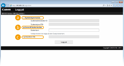 Du kan alle handlinger og innstillinger for Fjernkontroll. Hvis det angis en avdelings-ID, må du legge inn korrekt ID i [Systemadministrator-ID] og korrekt PIN-kode i [Systemstyrer-PIN].