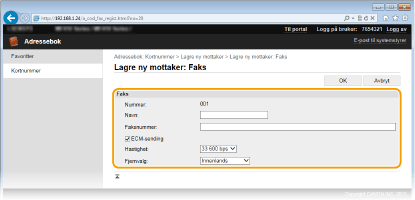 Du kan også angi [ECM-sending] og [Hastighet] fra <Faksinnstillinger> ( Faksinnstillinger (MF515x)) på driftspanelet. Innstillinger som gjøres fra <Adressebok> er imidlertid aktivert for de detaljerte innstillingene for mottakere som er registrert i adresseboken.