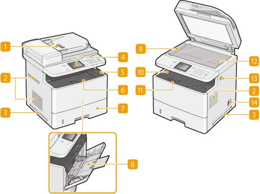 Syöttää asiakirjat automaattisesti laitteeseen skannausta varten. Kun syöttölaitteeseen asetetaan kaksi tai useampia arkkeja, asiakirjat voidaan skannata peräkkäin.
