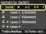 Voit tallentaa usein käytetyt faksin/skannauksen vastaanottajat osoitekirjaan, josta niitä on helppo valita tarvittaessa. Vastaanottajia voidaan etsiä aakkosjärjestyksessä osoitekirjan luetteloista tai syöttämällä kolme numeroa pitkiä lukuja numeron (lyhytvalintanumeroita). Voit myös määrittää vastaanottajia nopeasti seuraavien toimintojen avulla.