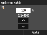 tai syötä kopiointisuhde numeropainikkeilla ja napauta <Käytä>. Voit asettaa kopiointisuhteen 1 % tarkkuudella väliltä 25–400 %.