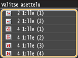 Asetus <2 1:lle>/<4 1:lle> pienentää kopiosuhteen automaattisesti (kopiosuhde näytetään näytössä). Voit suurentaa tai pienentää kopiosuhdetta ennen