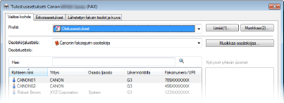 Tässä osassa kuvataan vastaanottajien tallentaminen osoitekirjaan tietokoneesta faksaamista varten. Voit valita yksittäisiä osoitekirjaan tallennettuja vastaanottajia ja tehdä vastaanottajaryhmän (ryhmävalinta), mikä on hyödyllistä, kun halutaan lähettää useille vastaanottajille samalla kertaa.