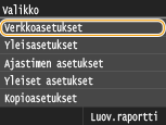 Kaikki verkkoasetukset ja lyhyet kuvaukset luetellaan. Oletusasetukset on merkitty tikarilla (
