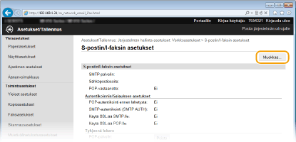 Käytetystä verkosta riippuen SMTP- tai POP3-porttiasetus täytyy ehkä muuttaa ( Porttinumeroiden muuttaminen). Lisätietoja saat Internet-palveluntarjoajaltasi tai verkon pääkäyttäjältä.
