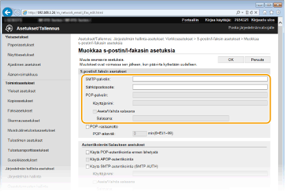 Jos SMTP-autentikointi (SMTP AUTH) määritetään, käyttäjän tunnistus käyttäjänimen ja salasanan perusteella suoritetaan sähköpostia tai I-faksia lähetettäessä.