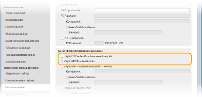 Jos haluat käyttää POP3-palvelinta autentikointiiin ennen sähköpostin tai I-faksien lähettämistä, valitse valintaruutu.