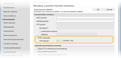 Tämä asettaa käytettävän aikavälin (minuutteina), jota käytetään POP3-pavelimen automaattiseen yhdistämiseen. Jos palvelimella on yhtään I-faksiasiakirjaa, ne vastaanotetaan ja tulostetaan automaattisesti.