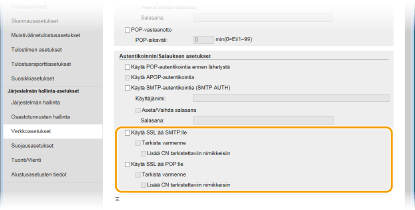 Valitse tämä valintaruutu, kun haluat käyttää TLS-salausta tiedonsiirrossa POP3-palvelimen kanssa. Valitse valintaruudut [Tarkista varmenne] ja [Lisää CN tarkistettaviin nimikkeisiin] tarpeen mukaan.