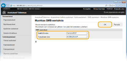 SMB (Server Message Block) on protokolla, jolla jaetaan resursseja, kuten tiedostoja ja tulostimia, useamman kuin yhden verkossa olevan laitteen kanssa. Laite käyttää SMB-protokollaa skannattujen asiakirjojen tallentamiseen jaettuun kansioon. Verkosta riippuen voit joutua asettamaan NetBIOS-nimen ja työryhmän nimen.