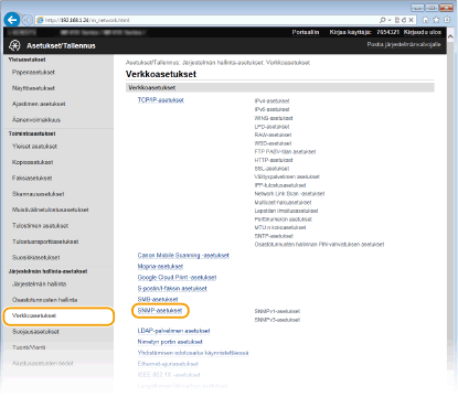 Voit ottaa SNMP-asetukset käyttöön tai poistaa ne käytöstä kohdassa <Valikko>. SNMP-asetukset