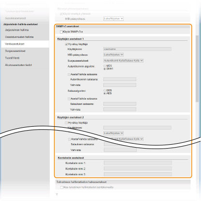 SNMP (Simple Network Management Protocol) on protokolla, jolla valvotaan ja ohjataan verkon tiedonsiirtolaitteita käyttämällä MIB:tä (Management Information Base). Laite tukee SNMPv1-protokollaa ja edistyneemmän suojauksen SNMPv3-protokollaa. Voit tarkistaa laitteen tilan tietokoneesta, kun tulostat asiakirjoja tai käytät Etäkäyttöliittymää. Voit ottaa käyttöön SNMPv1:n, SNMPv3:n tai molemmat samanaikaisesti. Määritä kunkin version asetukset verkkoympäristöön ja käyttötarkoitukseen sopiviksi.