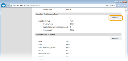 Valitse tämä valintaruutu, jos haluat, että laitehallinnan ohjelmistolle ilmoitetaan laitteen virran tila. Kun valitaan [Ilmoita], laite välttää turhaa tiedonsiirtoa lepotilan aikana ja kokonaisvirrankulutus pienenee. [Porttinumero]
