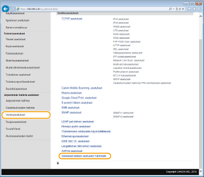 iW Management Console-ohjelmiston lisäosien käyttäminenVaratun portin asetukset ja SNMP-asetukset täytyy ottaa käyttöön. Valitse SNMP-asetuksissa [MIB-pääsyoikeus]-asetukseksi [Luku/Kirjoitus] sekä SNMPv1- että SNMPv3-lisäosaa varten.