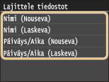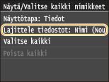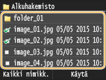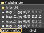 ![]() ![]() Kun valitset <Päiväys/Aika (Nouseva)> tai <Päiväys/Aika (Laskeva)>, tiedostot lajitellaan niiden muokkauspäivän ja -ajan mukaan.