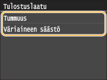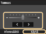 / ja napauta sitten <Käytä>. Huomaa, että jos <Väriaineen säästö> -asetukseksi on valittu <Kyllä>, tätä kohdetta ei voi asettaa.![]() ![]() Väriaineen tummuuden hienosäätö