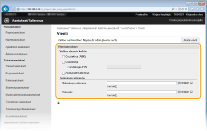 Salaa vientitiedot syöttämällä salasanaksi enintään 32 merkkiä. Syötä sama salasana kohtaan [Vahvista]. Jos [Osoitekirja]- tai [Asetukset/Tallennus]-valintaruutu on valittu, tietoja ei voi viedä ilman salauksen salasanan asettamista.