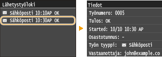 ![]() <Lähetystyöloki>Näyttää luettelon lähetetyistä asiakirjoista. <OK> näytetään, kun asiakirjan lähetys onnistui, ja <Virhe>, kun asiakirjan lähetys epäonnistui, koska se peruutettiin tai tapahtui virhe.