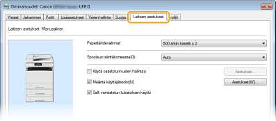 Valitse tämä valintaruutu, kun haluat näyttää [Vahvista osastotunnus/PIN-koodi] -ponnahdusikkunan aina, kun tulostetaan tai faksataan tietokoneesta. [Todenna osastotunnus/PIN-koodi laitteessa]