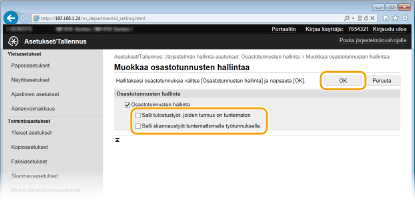 Vahvista tätä napsauttamalla, että on syötetty oikea tunnus ja PIN. Tämä toiminto ei ole käytettävissä, mikäli laite ja tietokone on yhdistetty USB- tai WSD (Web Services on Devices) -portin välityksellä. [Vahvista osastotunnus/PIN-koodi tulostuksen yhteydessä]/[Vahvista osastotunnus/PIN-koodi fakseja lähetettäessä]
