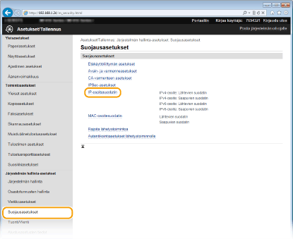 Jos IP-osoitteet on syötetty väärin, et ehkä pysty käyttämään laitetta etäkäyttöliittymästä, missä tapauksessa sinun on valittava <IPv4-osoitesuodatin>- tai <IPv6-osoitesuodatin>-asetukseksi <Ei>.