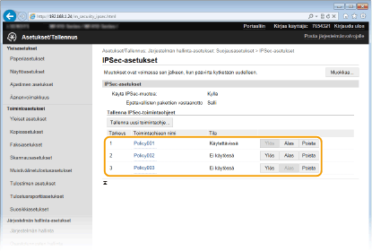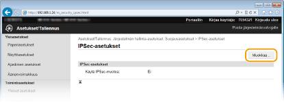 Käyttöpaneelin käyttäminenVoit ottaa IPSec-tiedonsiirron käyttöön tai poistaa sen käytöstä myös kohdassa <Valikko>, joka on Koti-näytössä. Käytä IPSec-muotoa
