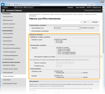 Valitse, kun IPSec-protokollaa käytetään kaikkiin IP-paketteihin, jotka lähetetään tai vastaanotetaan laitteen IPv4-osoitteesta.