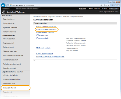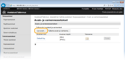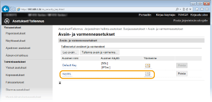 Avainparia ei voi poistaa, jos on käytössä esimerkiksi kun "[TLS]" tai "[IEEE 802.1X]" näytetään kohdassa [Avaimen käyttö]. Poista tässä tapauksessa toiminto käytöstä tai vaihda avainpari ennen sen poistamista.